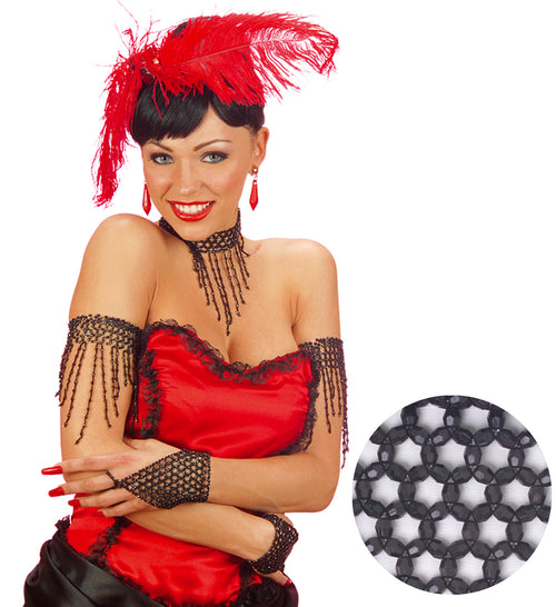 Zwarte parel arm versierselen voor retro jurkjes Deze zwarte armbandjes met pareltjes in netvorm zijn leuk bij jaren 60 en 70 retro kleding voor carnaval of voor party's. Op deze site vind je heel veel carnaval sieraden die passen bij...
