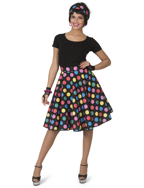 Stap in de tijdmachine met de Rock en roll rok Hotty Dotty dames! Perfect voor een swingende avond vol plezier en dans. Laat de jaren '50 herleven! Kenmerken One size fits all: S-L Gekleurde stippen Inclusief sjaal/hoofdband Verstelbare taille 78-90...