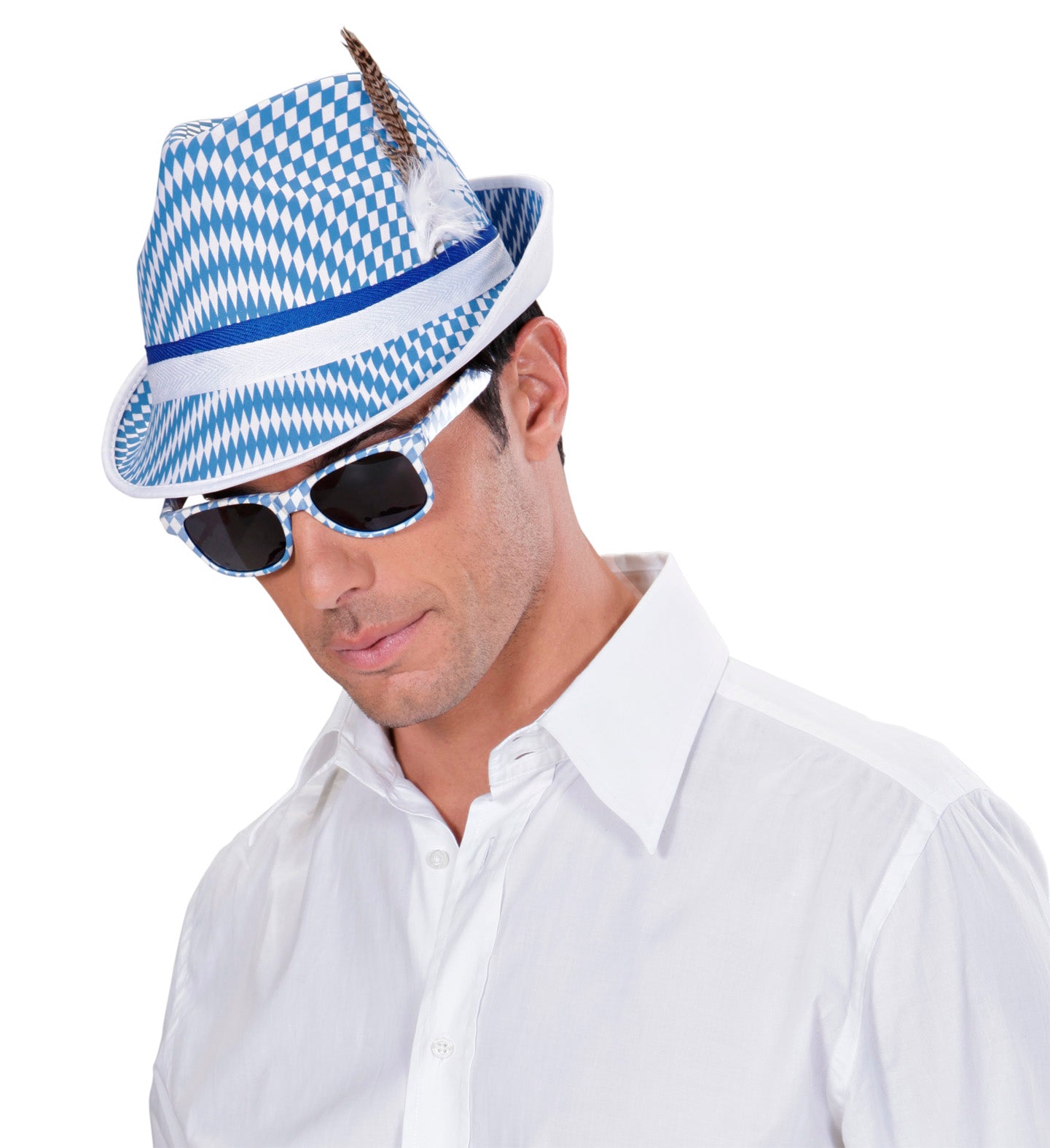 Oktoberfest gleufhoed met veer blauw wit