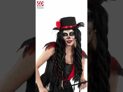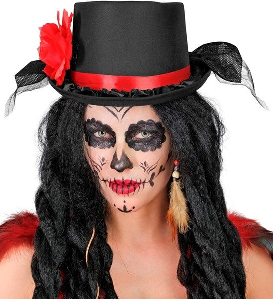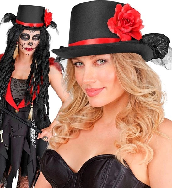 Hoge hoed zwart met tule en rode roo Stijn