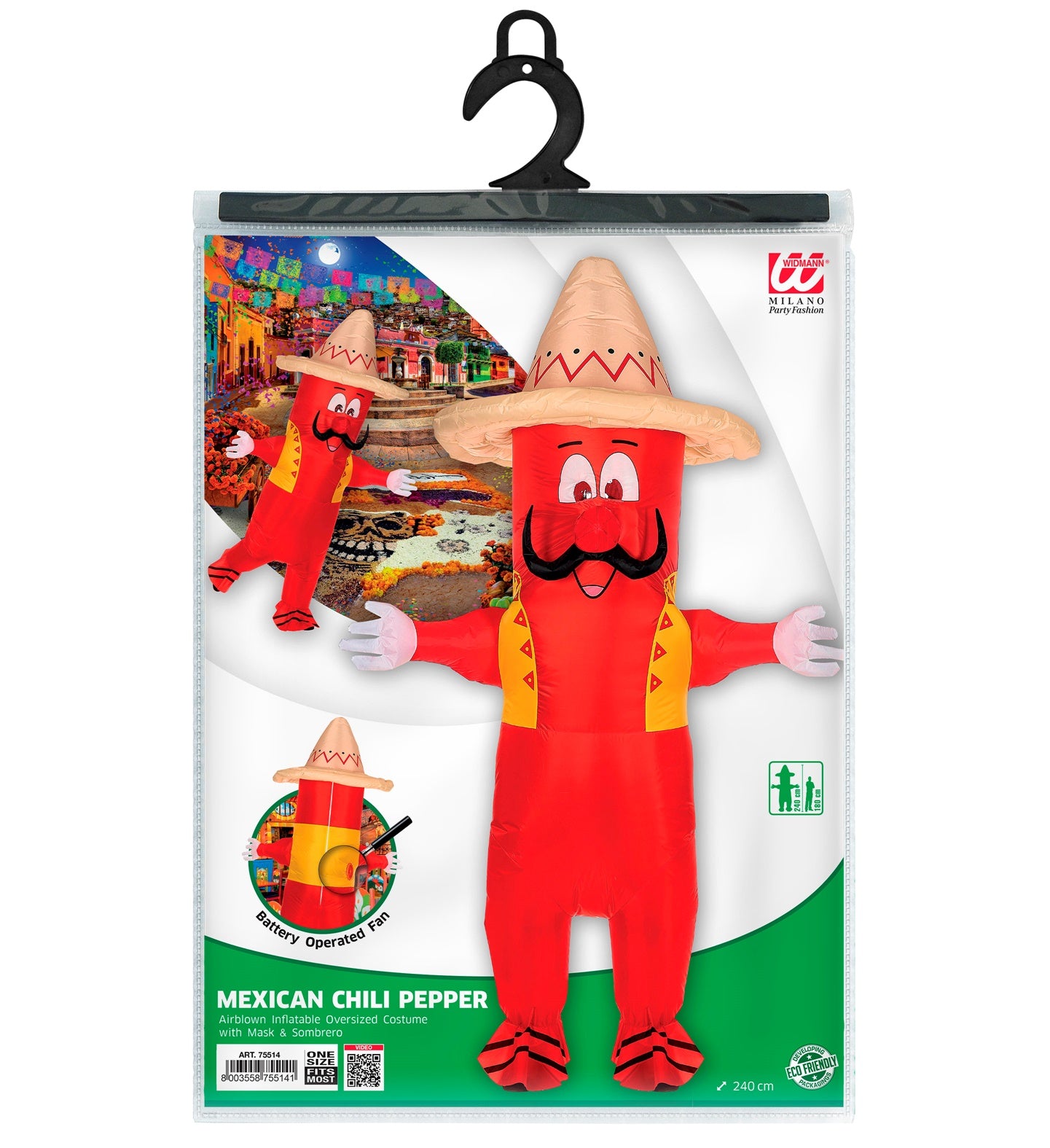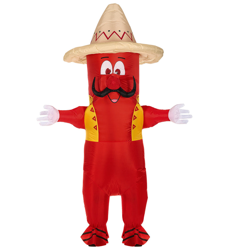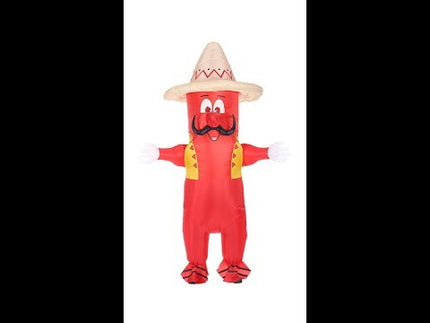 Leuk opblaasbaar kostuum Chili Peper in one size fits most voor de maten M/L omvat het kostuum, masker en sombrero.... Lees meer