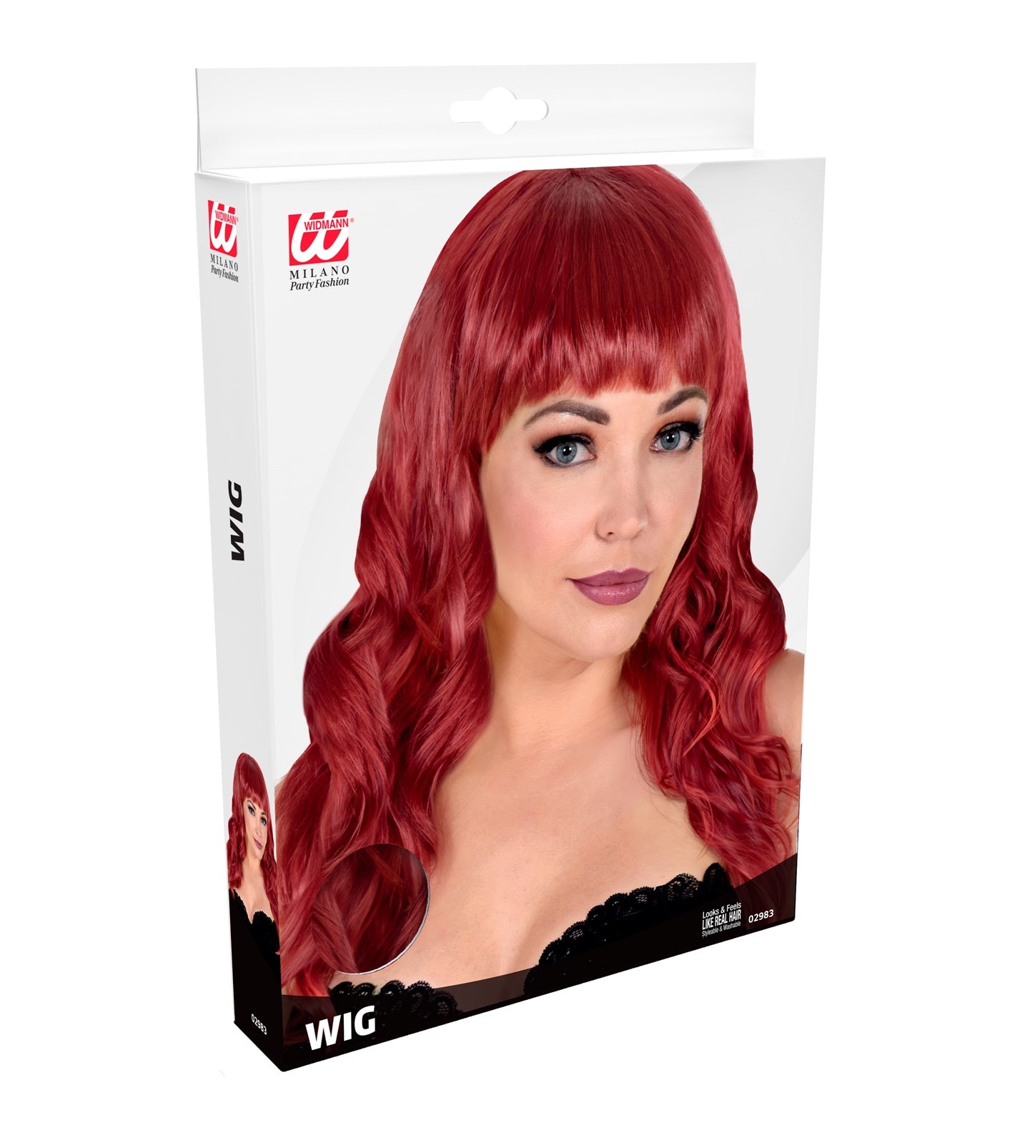 Koperkleur pruik met pony en lang krullend haar
