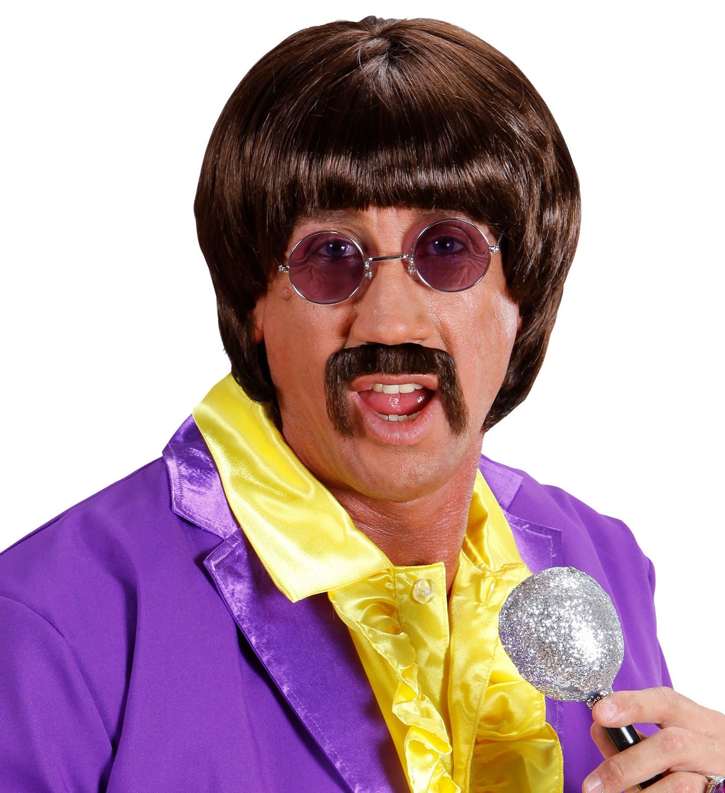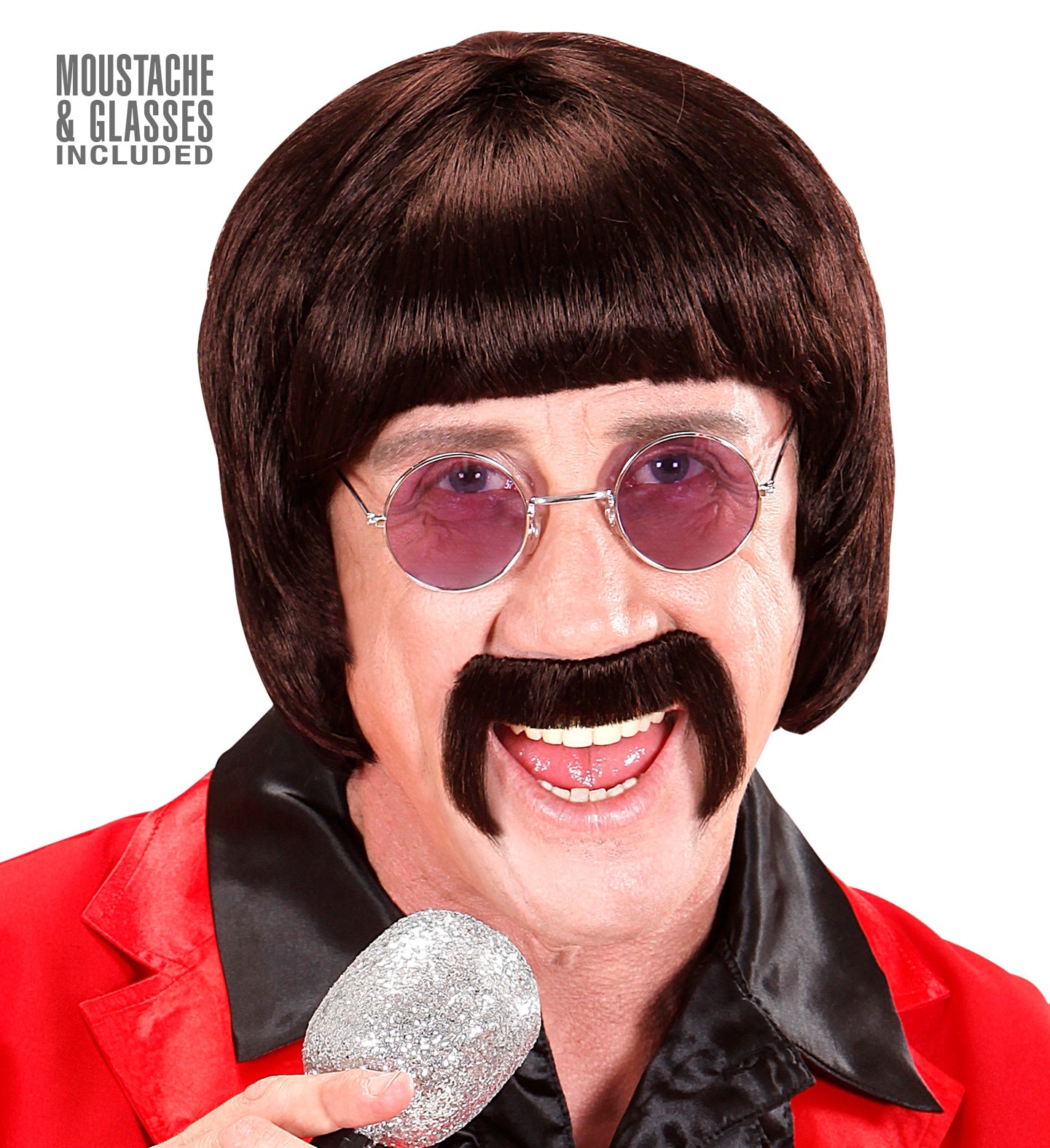 pruik popster 60s bruin met snor en bril