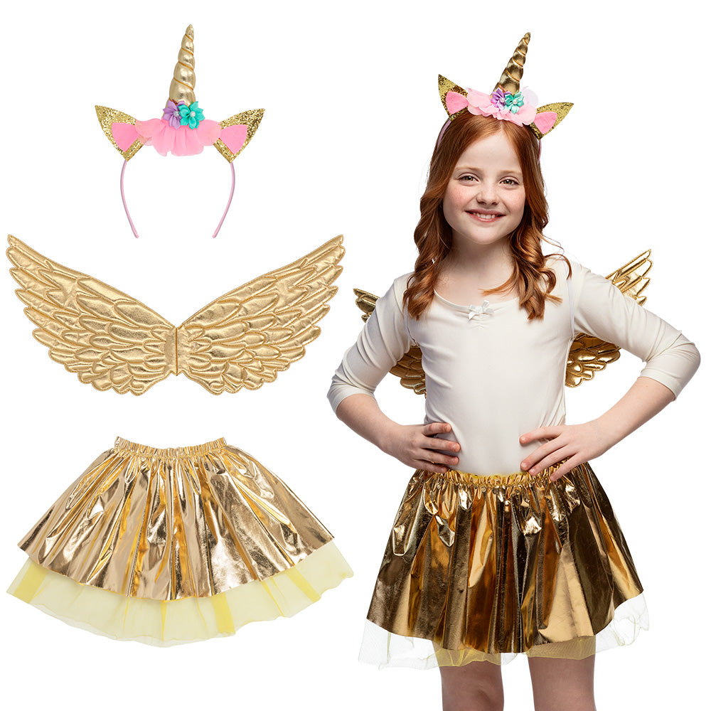 Met de Unicorn eenhoorn verkleed set goud transformeer je in een handomdraai in een magische eenhoorn. De gouden diadeem met hoorn zorgt ervoor dat je meteen opvalt, terwijl de vleugels je het gevoel geven dat je zo de lucht in kunt zweven. De speelse tutu maakt het plaatje compleet en zorgt ervoor dat je bij elke stap een beetje magie verspreidt. Ideaal voor meisjes die houden van fantasie en avontuur!